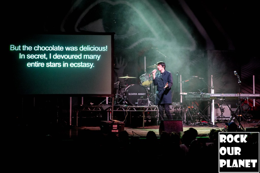 The night started with Joseph Keckler. Keckler came out on stage with a large screen next to his microphone stand. He opened with ‘Shroom Aria’ (Shroom Trip Opera) about how he got high after eating shoom laced chocolate. The screen was so people could understand what he was singing as he sang most in a foreign language.