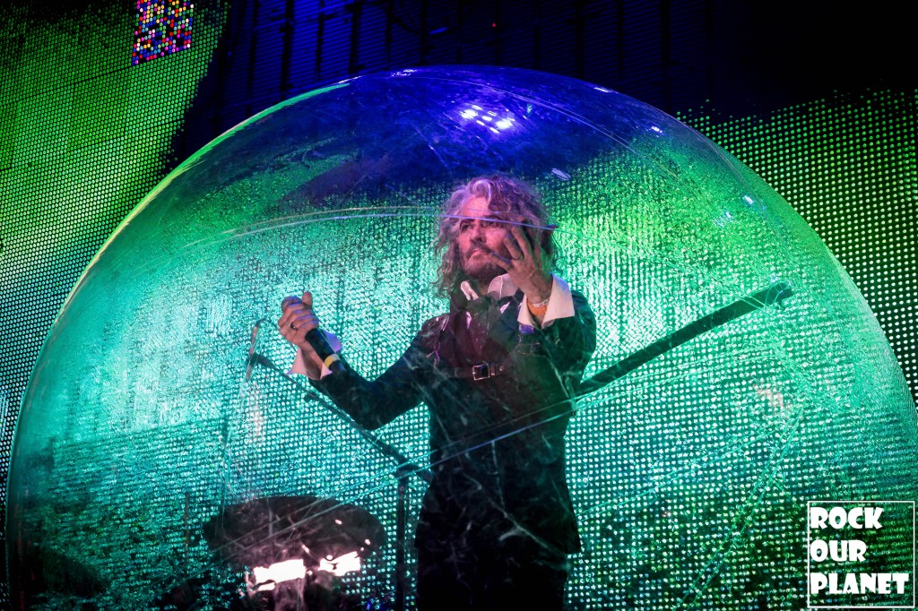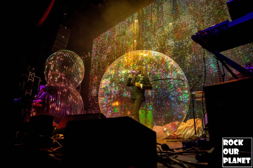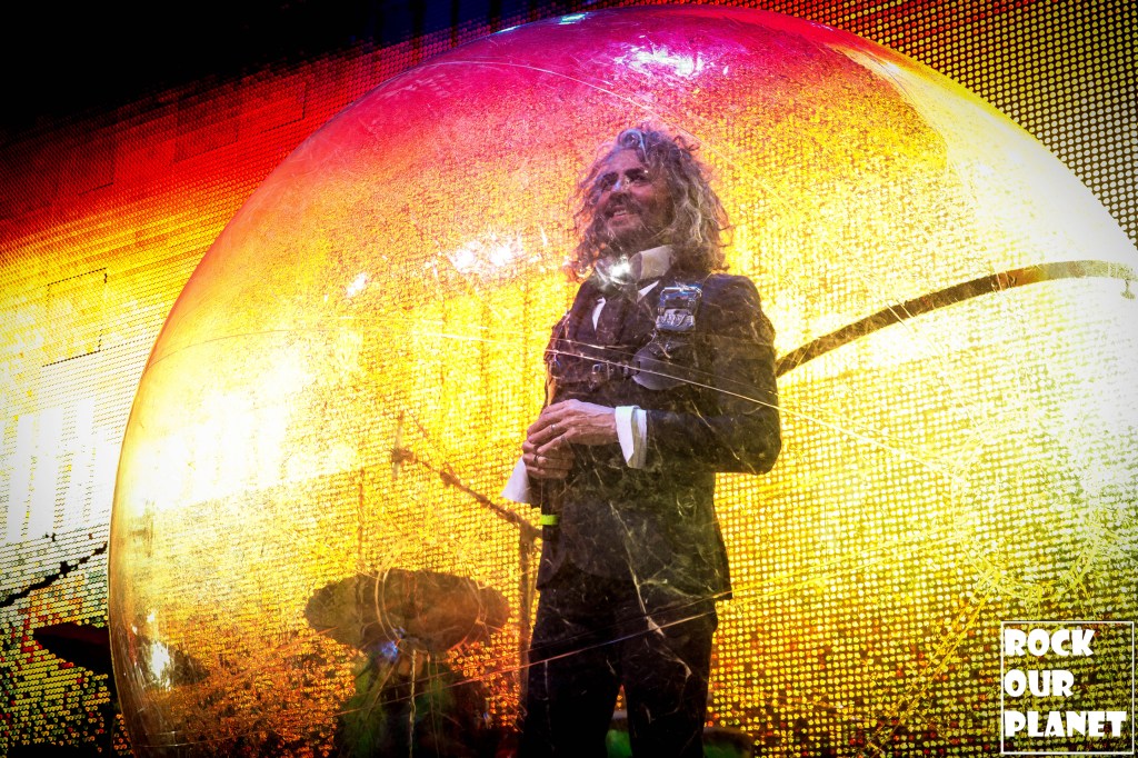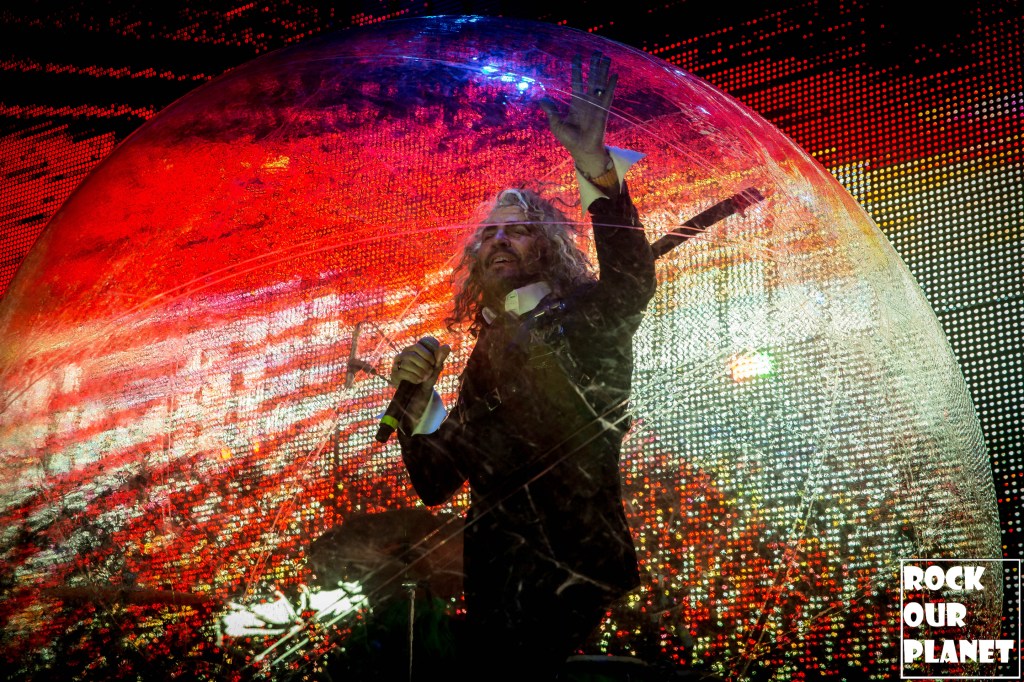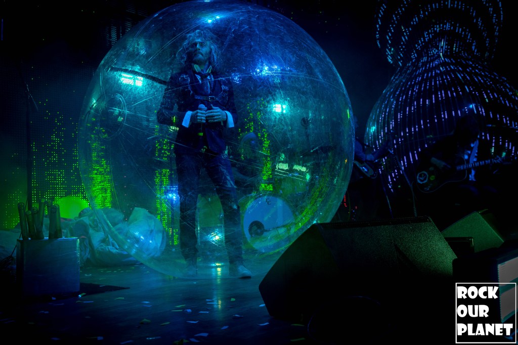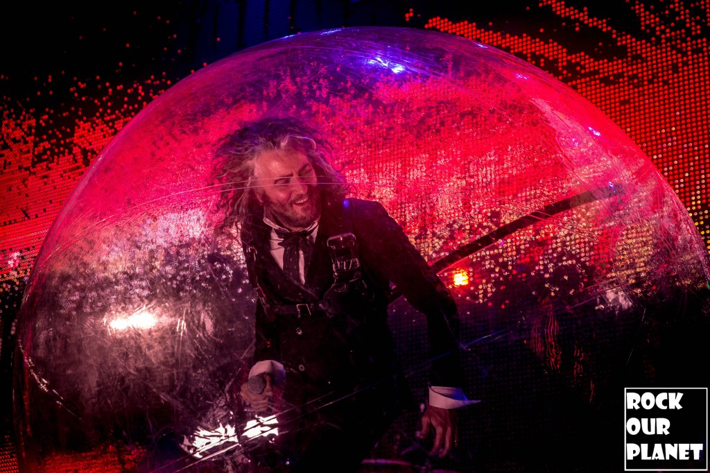 As the rest of the band made its way onto the stage an stage hand helped Coyne get into one of his now iconic bubbles and started the night with ‘My Cosmic Autumn Rebellion’. A flaming Lips show is not just for the ears but also for the eyes. Between giant inflatables like a huge rainbow during the second song of the night ‘Do You Realize??’, to a giant pink robot during ‘Yoshimi Battles the Pink Robots, Pt. 1’, also one of the few times Coyne was not in a bubble during the show, loads of confetti, bubbles, and lights galore.