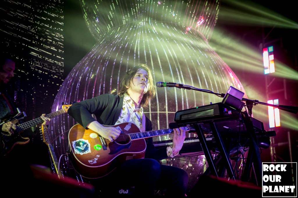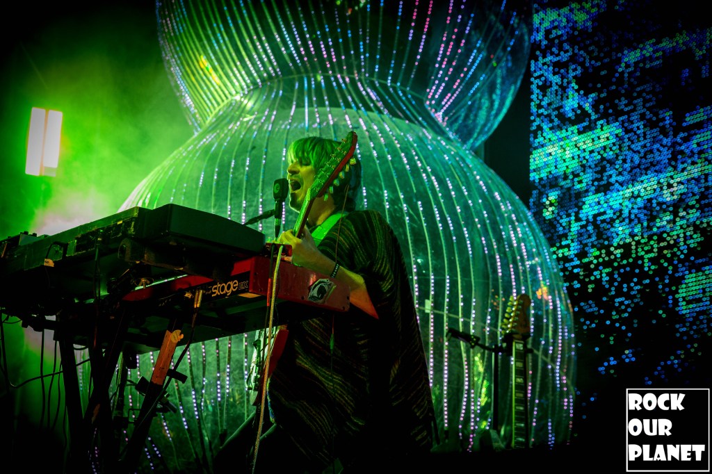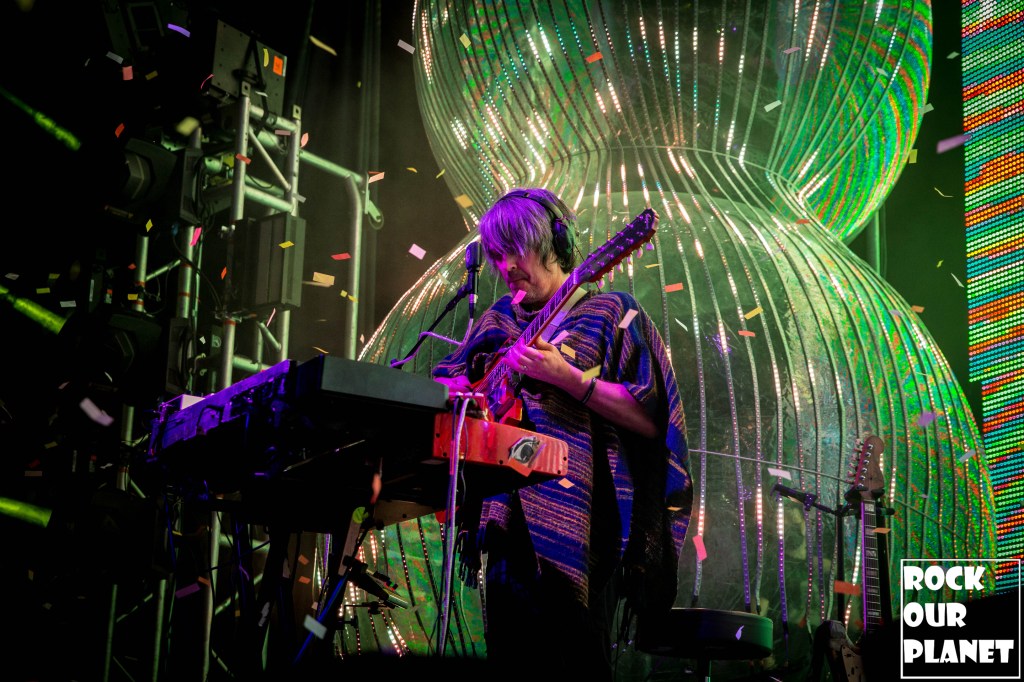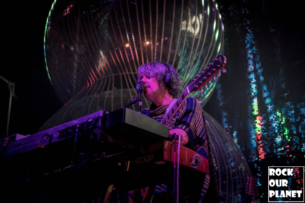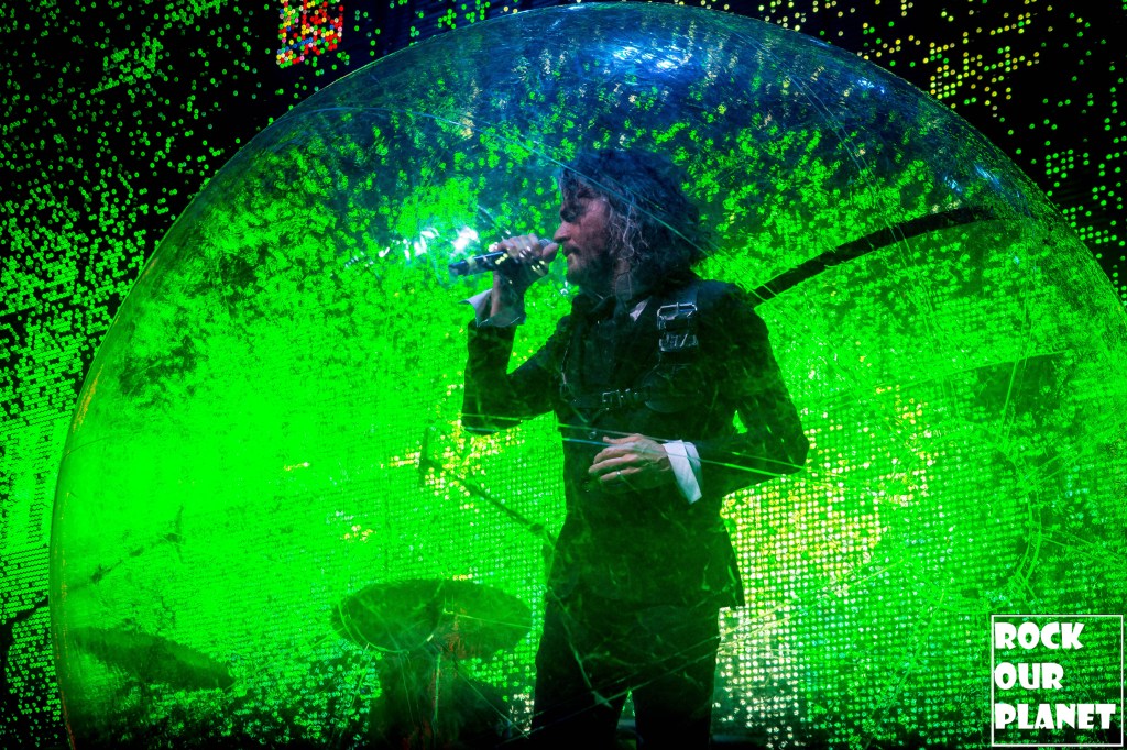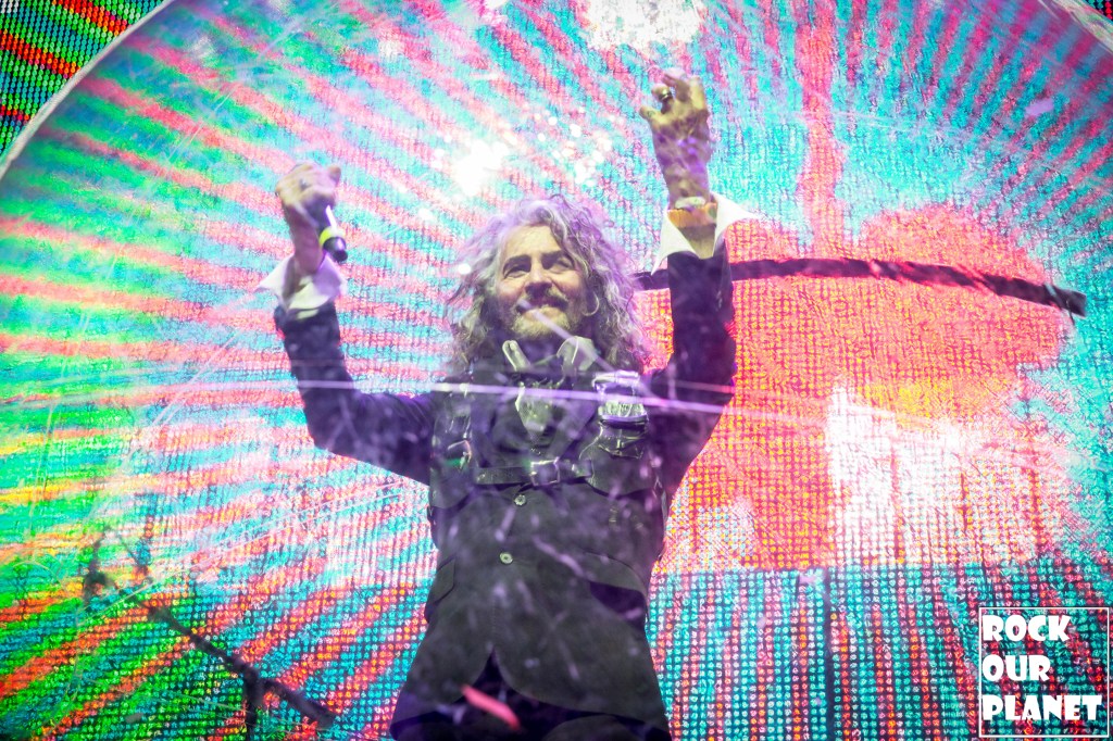 As the rest of the band made its way onto the stage an stage hand helped Coyne get into one of his now iconic bubbles and started the night with ‘My Cosmic Autumn Rebellion’. A flaming Lips show is not just for the ears but also for the eyes. Between giant inflatables like a huge rainbow during the second song of the night ‘Do You Realize??’, to a giant pink robot during ‘Yoshimi Battles the Pink Robots, Pt. 1’, also one of the few times Coyne was not in a bubble during the show, loads of confetti, bubbles, and lights galore.