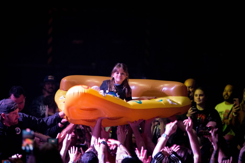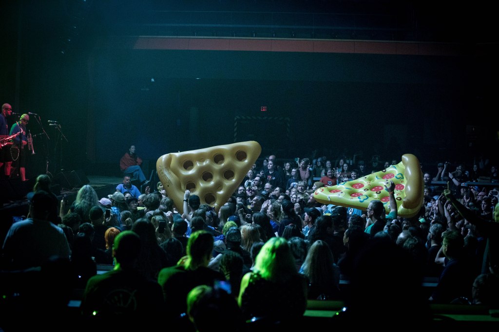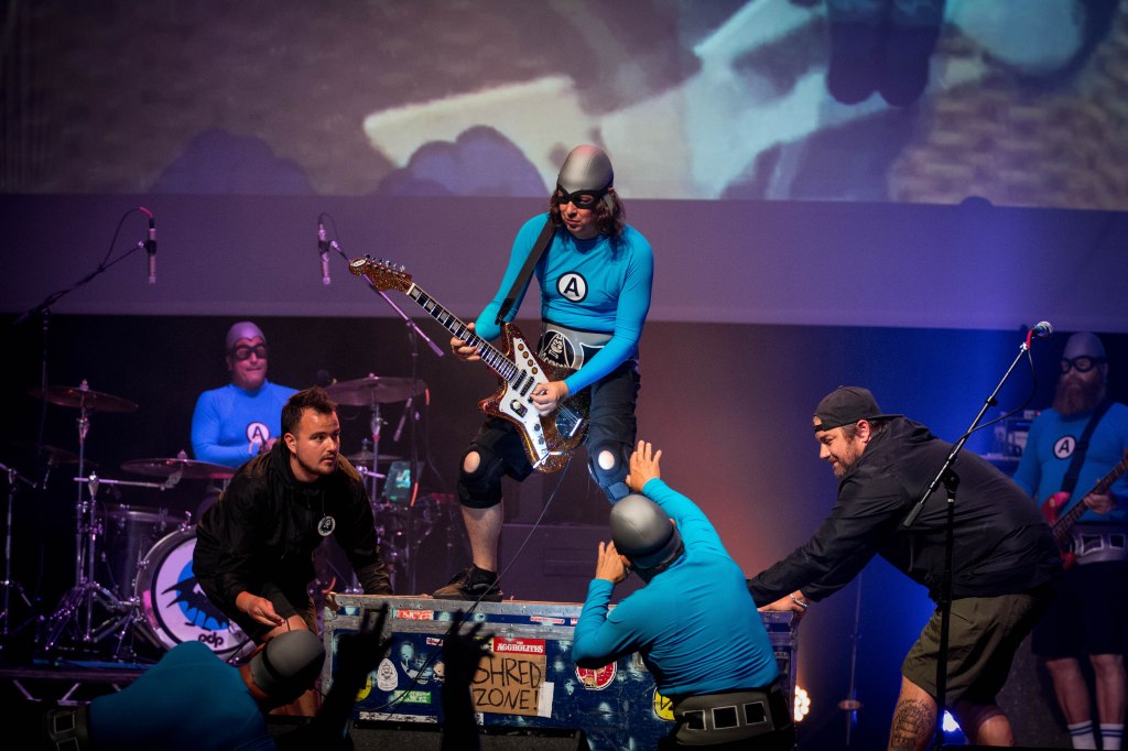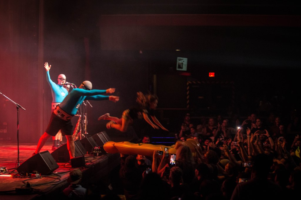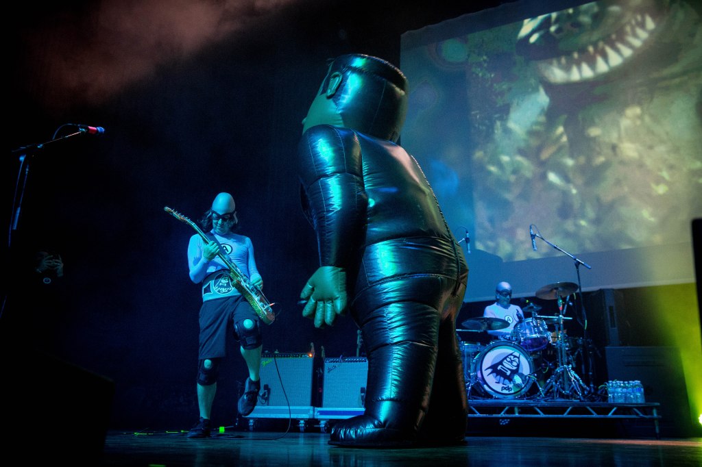 An Aquabats concert is not just a concert but an experience. Between fans coming dressed up as cadets and other costumes, the bands interaction with the fans, and the pure chaos of what is happening on stage. The band kicked things off with ‘The Shark Fighter!’ by throwing four large inflatable sharks into the crowd. During the song ‘Pizza Day! two large inflatable slices of pizza were thrown into the crowd. After the song was over the MC Bat Commander brought a young fan named Averi on stage and she became a member of The Aquabats. The MC Bat Commander asked the Tribe (what he calls the fans) to make sure that they catch Averi as he tossed her into the crowd and landed on one of the slices of pizza and surfed throughout the crowd. Most the night a good majority of the fans were dancing and having a good time. During ‘No Rewind!‘ MC Bat Commander singled out the ‘luxury boxes’ like the Monsanto box, the Dupont box, and the FedEx box, pointing to random areas to the side and back of the venue and made everyone dance. After Super Rad! the MC Bat Commander introduced members of the band and each one performed a solo or played a snippet of a song. Jimmy the Robot started to play ‘Brass Monkey‘ by the Beastie Boys but was stopped by the MC Bat Commander due to the content of the song. The night ended with the chaotic Pool Party! that saw several beach balls tossed into the crowd along with the band being joind by both opening bands Koffin Kats, Mike V and the Rats, as well as several other colorful characters along with Big Bird and Grimace. A few other highlights of the night was when the MC Bat Commander was skateboarding around while singing ‘My Skateboard!‘, the fight between the band and the Ska Witch and her creation the Batkatrat, and a fake commercial for S.C.A.B.S.! from their The Aquabats! Super Show!. All in all if the band is ever in town they put on a great show that you can take the whole family to.