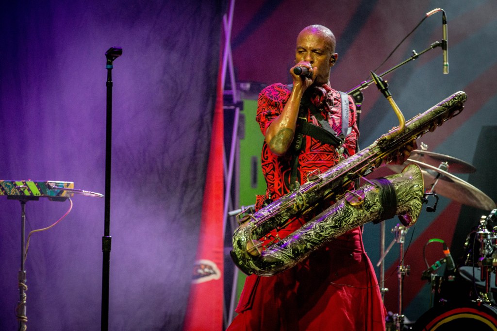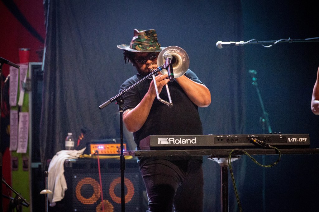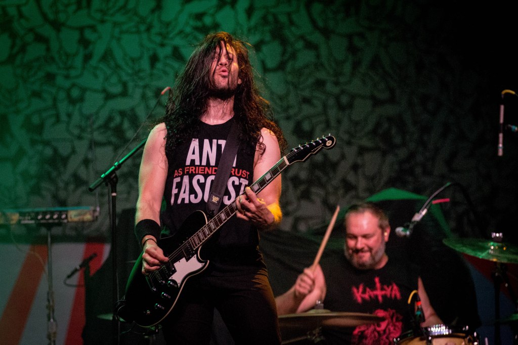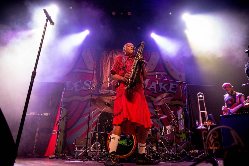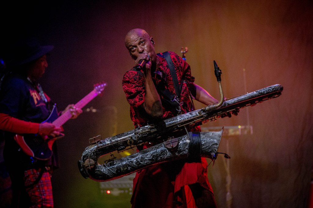 As soon as members of Fishbone started to take the stage you could feel the energy that they bring starting to swell. Angelo Moore, dressed in a red and black top, a red kilt and a matching red bowler hat, grabbed the mic and said this set is called ‘Fuck President Trump’ before the band kicked into ‘Party at Ground Zero‘. Talking to a fan the following night at Coheed and Cambria he said that Moore reminds him of a cartoon caricature brought to life and that is probably the best way to describe him as he has boundless energy and his stage presence is practically unmatched from any band that I have seen. Keyboardist Kayleigh Malloy of Catbite accompanied the band on saxophone. Catbites Brittany Luna accompanied the band for ‘Lyin’ Ass Bitch‘. Angelo’s daughter Cheyenne came out and played saxophone and sang on ‘Skankin’ to the Beat’ and closed out the set with ‘Racist Piece of Shit‘. After their set fans could find Moore and a few other members of the band at the merch table talking with fans, getting pictures taken, and having things signed. I happened to have brought an 8×10 picture that I had shot with black and white film back in 2011 at City Museum just in the off chance that I ran into Moore and was able to get it signed.