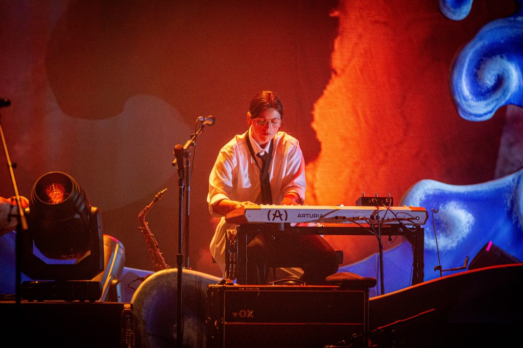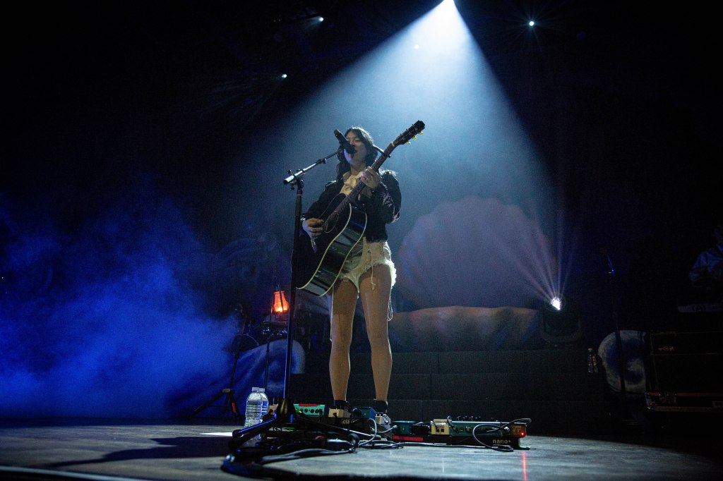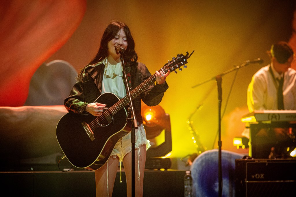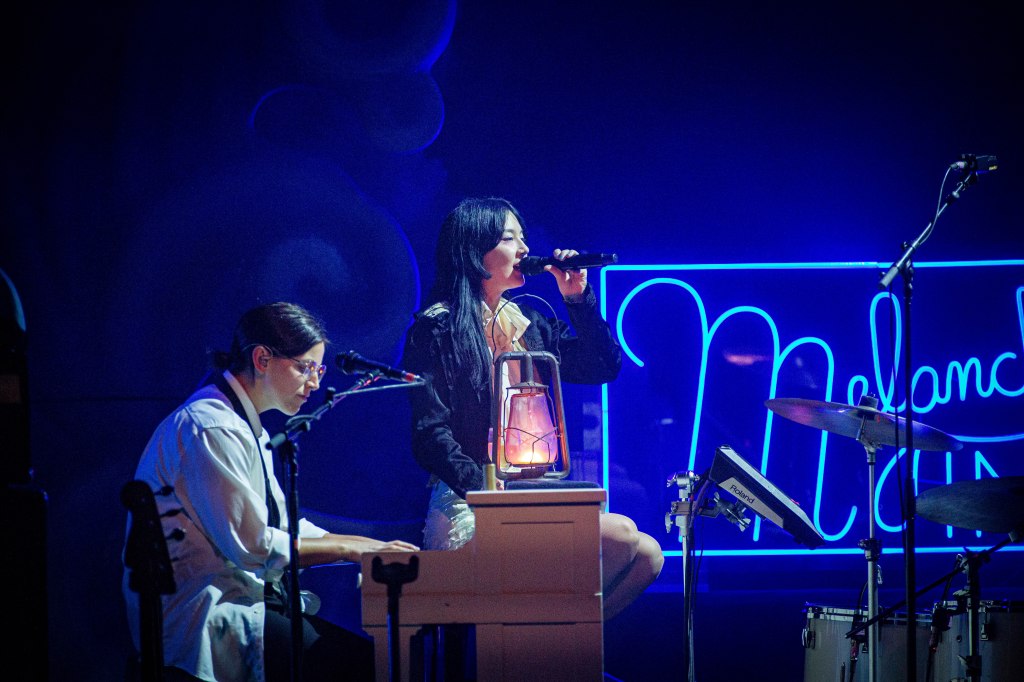 Zauner took the stage bathed in orange and yellow lights while wading through smoke holding a glowing lantern. She took a seat on the edge of a large clam shell that was positioned at the back of the stage and was flanked by Peter Bradley (guitar) and Deven Craige (bass) and started the night with ‘Here Is Someone’ off of the new album ‘For Melancholy Brunettes (& sad women)‘. During the set Zauner brought up memories saying that some of Little Big League‘s best shows were in St. Louis and remembers playing at The Library befor performing a cover of ‘Boyish‘. Later in the set what looked like possible technical difficulties but in reality a way forthe band to transition had Zauner sitting atop a piano with a large neon glowing sign that read “Melancholy Inn.” The magical night was closed out with a four song encore of ‘Posing for Cars’, ‘Paprika’, ‘Be Sweet’, and ‘Diving Woman’.